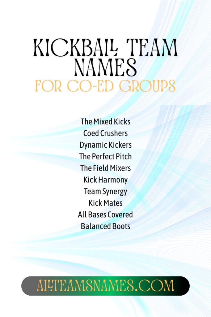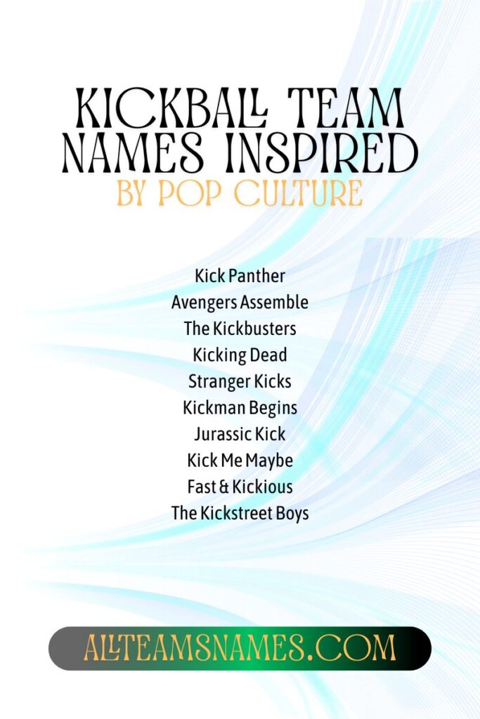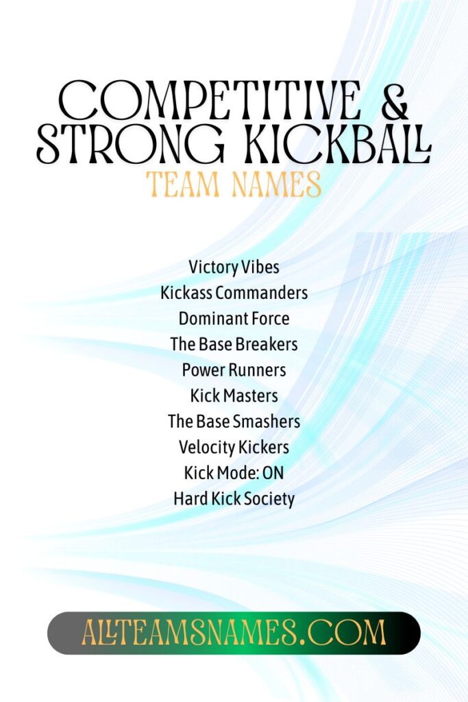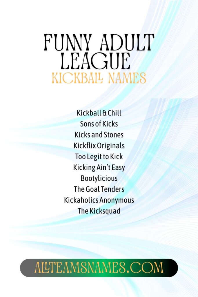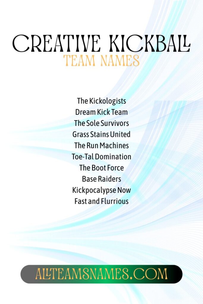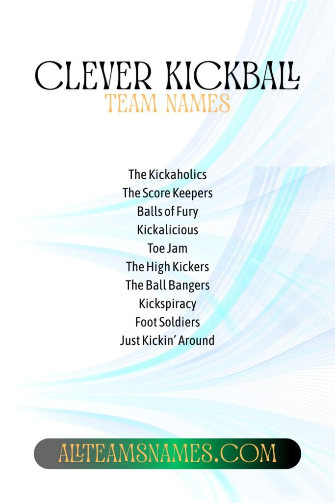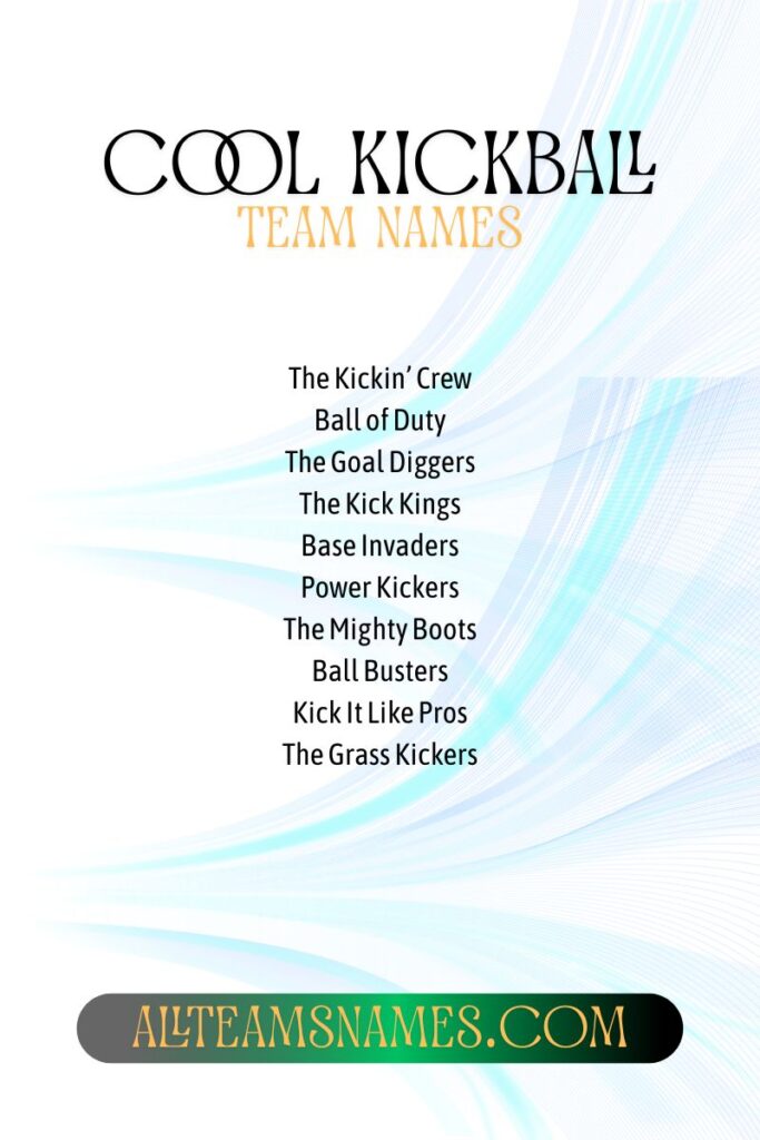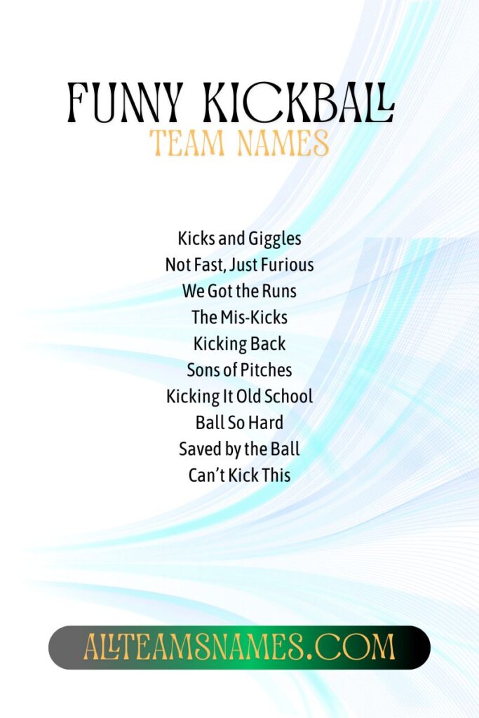 - What makes a great kickball team name? A great kickball team name is memorable, easy to pronounce, and reflects your team’s spirit. It can be funny, clever, or intimidating, depending on the vibe you want to create. The best team names also foster a sense of unity and pride among team members.